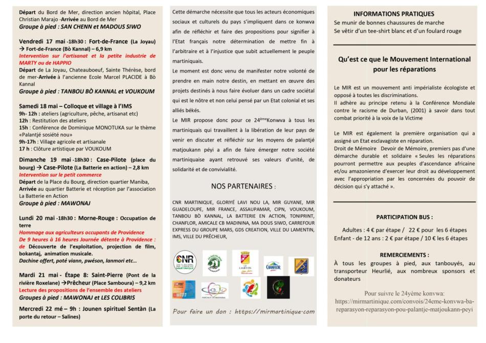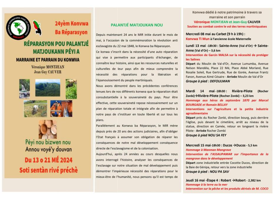 Depuis maintenant 24 ans le MIR initie durant le mois de mai, à l’occasion de la commémoration de la révolution anti esclavagiste du 22 mai 1848, le Konvwa ba Réparasyon.