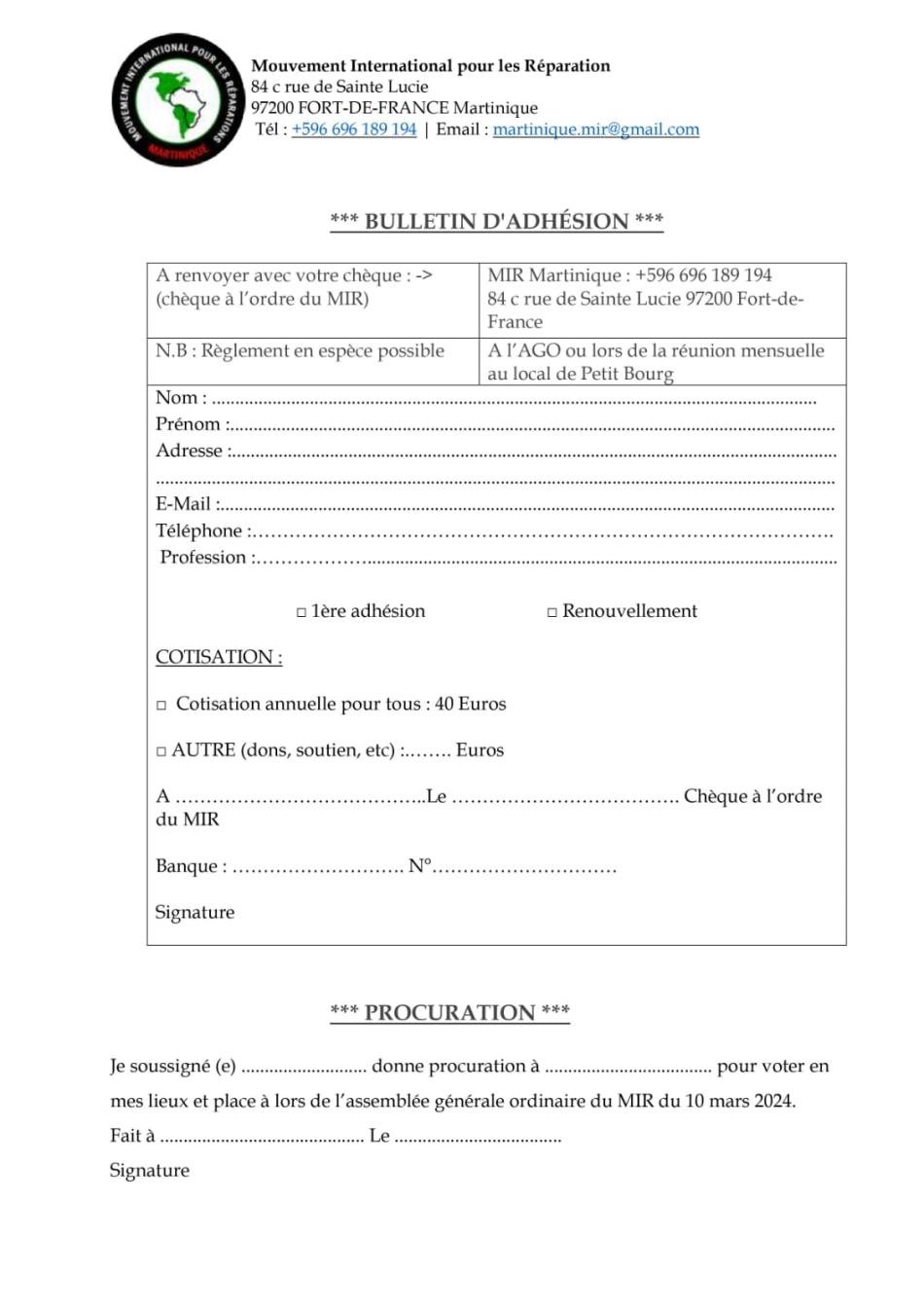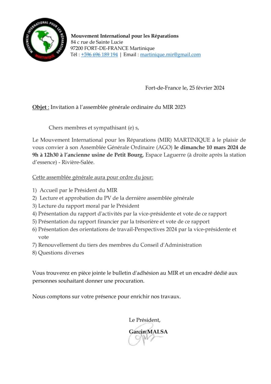 Le MIR Martinique a le plaisir de vous convier à son Assemblée Générale Ordinaire qui se tiendra le dimanche 10 mars 2024 de 9h00 à 12h30,